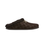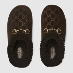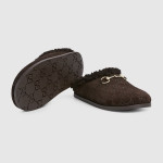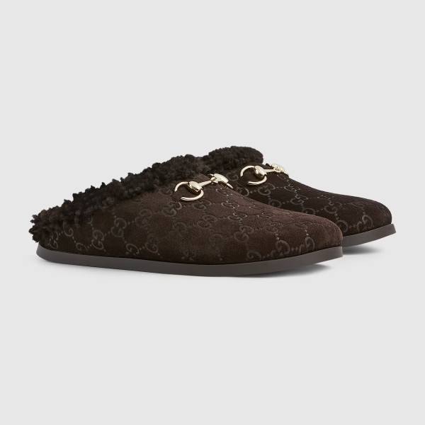 현대적인 시각을 통해 하우스의 전통을 재해석한 GG 스웨이드 소재의 여성용 뮬. 라이트 골드 톤 마감으로 표현한 시그니처 홀스빗 디테일이 디자인에 세련된 감성을 더함.