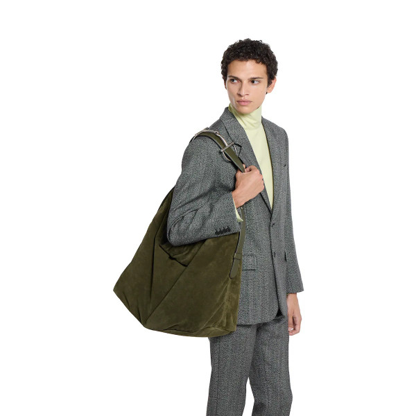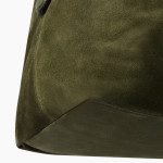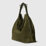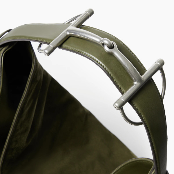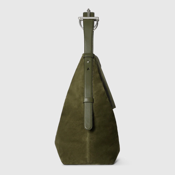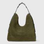 정교한 장인 정신과 섬세한 디테일을 보여주는 2025 가을-겨울 컬렉션의 구찌 홀스빗 1955 라지 크로스백. 더블 링과 바 디자인은 하우스의 대표 시그니처로 승마 세계에서 영감을 받아 탄생한 요소입니다. 이 디자인은 다크 그린 경량 소프트 스웨이드 베이스에 적용되어 있으며, 양 측면에는 하프 홀스빗 디테일을 더했습니다.