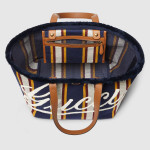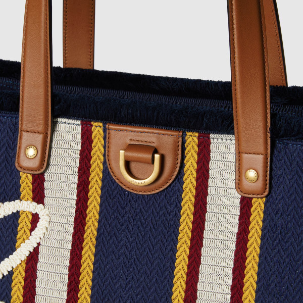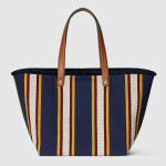 2025 봄 여름 남성 컬렉션은 새로운 모험에 어울리는 최신 트래블 아이템 및 남성 가방 셀렉션으로 자유, 에너지, 커뮤니티의 정신을 표현함. 시선을 사로잡는 스트라이프 헤링본 코튼 캔버스 앞면에 구찌 스크립트 자수로 마무리한 토트백.