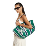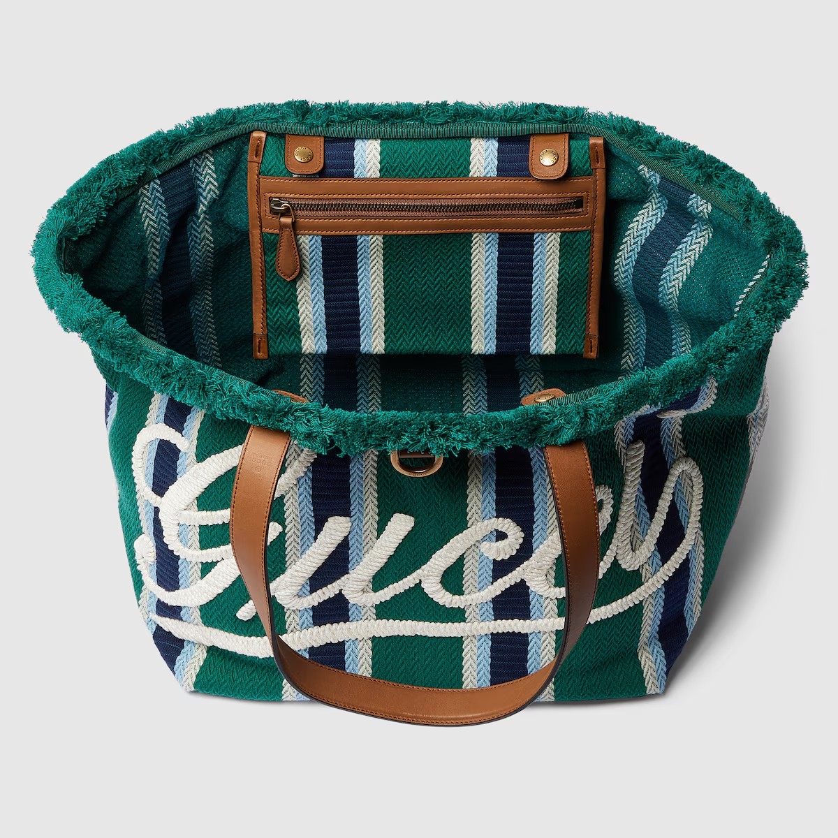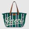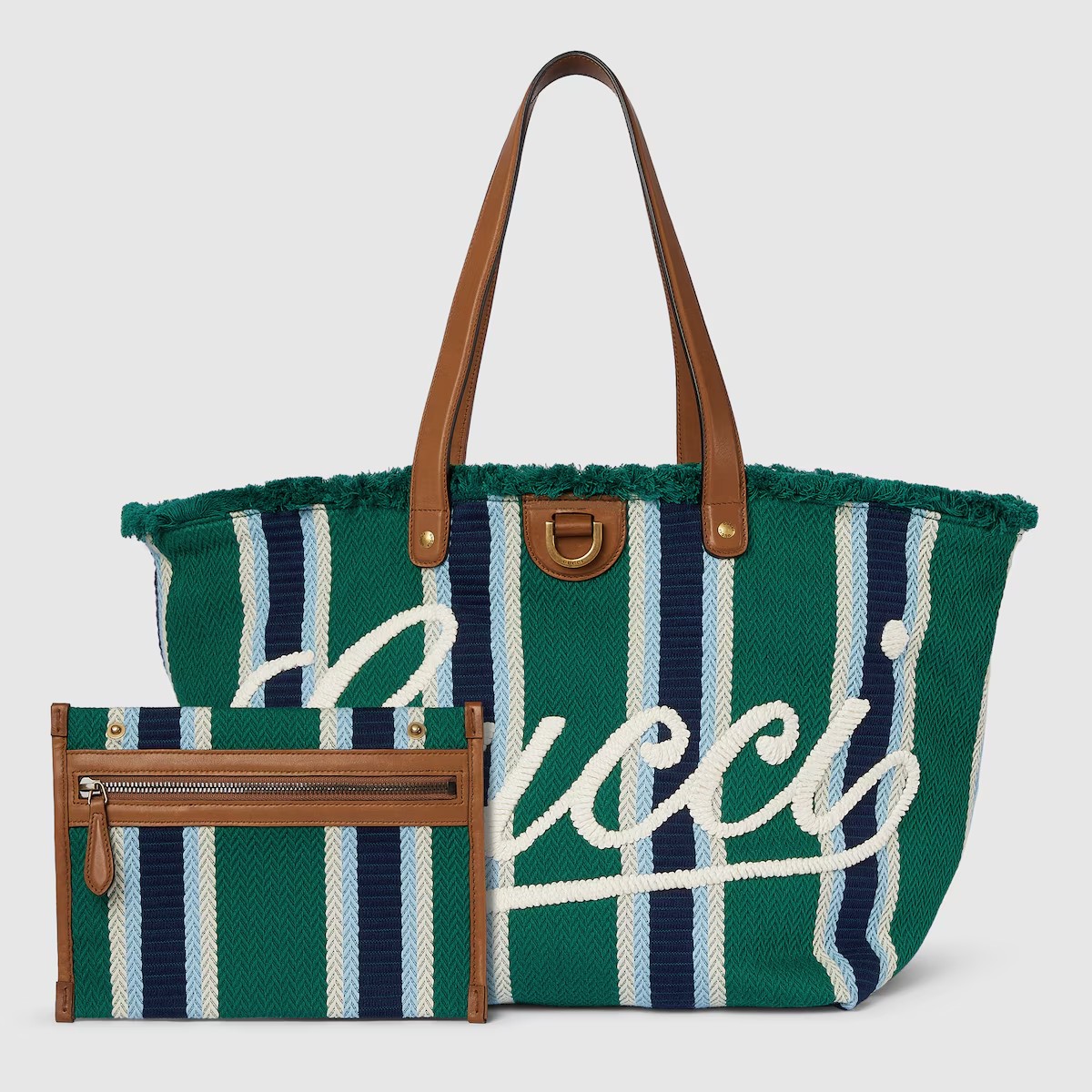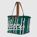 2025 봄 여름 남성 컬렉션은 새로운 모험에 어울리는 최신 트래블 아이템 및 남성 가방 셀렉션으로 자유, 에너지, 커뮤니티의 정신을 표현함. 시선을 사로잡는 스트라이프 헤링본 코튼 캔버스 앞면에 구찌 스크립트 자수로 마무리한 토트백.