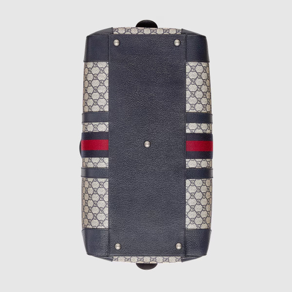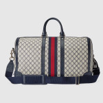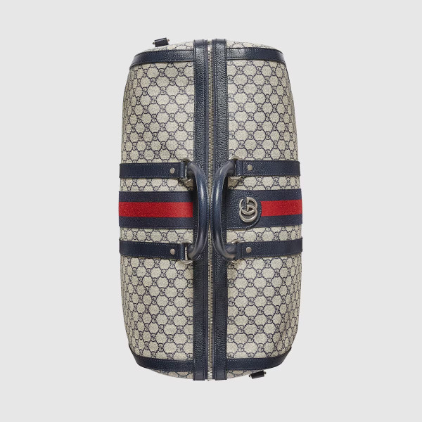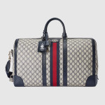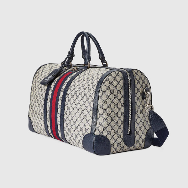 베이지/블루 GG 수프림 캔버스에 하우스 웹(Web)과 더블 G 메탈 장식을 특별하게 조합하여 구찌 사보이 라인으로 선보인 더플백. 탑 핸들 디자인에 조절 가능한 캔버스 스트랩이 추가되어 숄더백으로 사용 가능한 디자인. 안전한 지퍼 클로저로 실루엣 완성함.