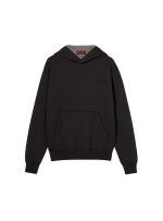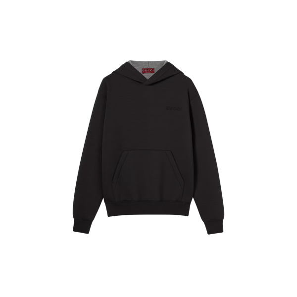 편안하면서도 기능성에 중점을 둔 2025 봄 여름 컬렉션의 스웨트셔츠. 고정식 후드와 캥거루 포켓이 특징인 더블 비스코스 저지 디자인. 가슴 부분에 섬세한 구찌 자수로 장식함.