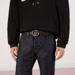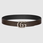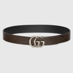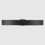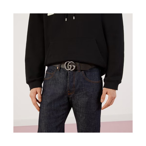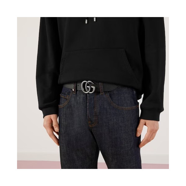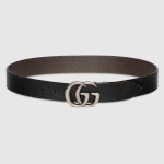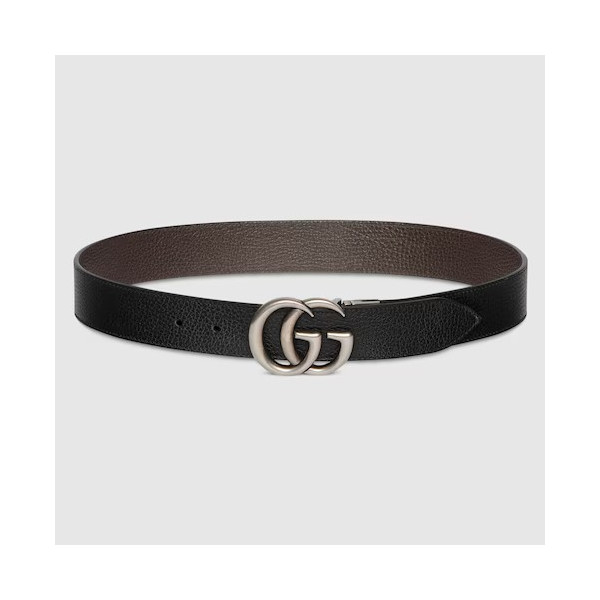 1970년대의 GG 메탈 장식을 현대적인 스타일로 선보이며 매 시즌 발전하는 GG 마몽의 상징적인 디자인. 뒤집어서 브라운 레더로 새롭게 연출 가능한 블랙 레더 와이드 벨트.