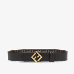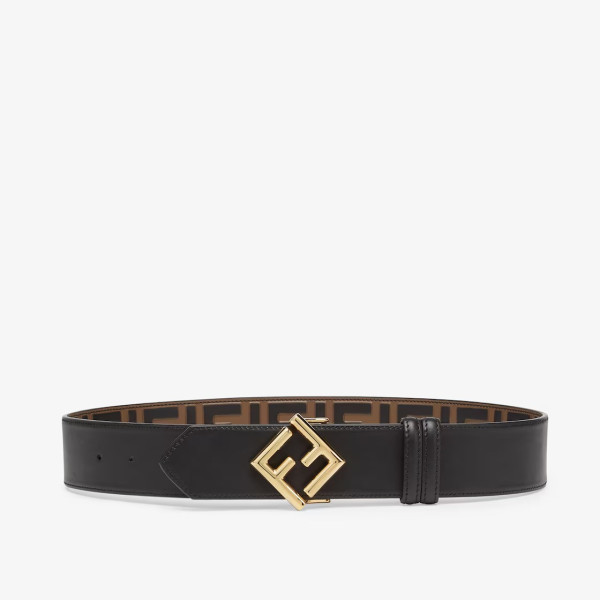 더블 루프와 사선 FF 스터드 버클의 리버서블 벨트. 블랙 컬러 엠보싱 FF 디테일의 브라운 가죽 소재. 블랙 컬러의 가죽 라이닝. 골드 피니시 메탈웨어. Made in Italy